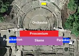 The proscenium in the main stage made entirely out of bricks and is supported by columns.[5] Behind the proscenium is the skene (theatre) which is where the behind the scenes productions occur. Opposed to other theaters, the Argos Theater skene is not the most luxurious. A tent was used for the space instead, and was assembled when needed.[4] The theater features a bisellium, a seated area designed to occupy honorary leaders.