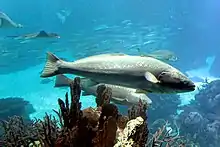Argyrosomus regius, also known as the meagre, croaker, jewfish, shade-fish, sowa, kir, corvina, salmon-bass or stone bass, is a species of fish of the family Sciaenidae. This large fish has a pearly-silver to brownish coloration and a yellow-coloured mouth. It is native to the eastern Atlantic Ocean, as well as the Mediterranean and Black Seas.[2]