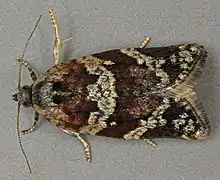The wingspan is 12–16 mm. Thorax has two hair-tufts. The species is quite variable in colour. The silver-white ground colour may be suffused with grey; and the usually red-brown markings may be close to black. The forewing tends to have three lighter cross-bands, the innermost of which sometimes has a square brown spot at the inner edge. The hindwings are grey-brown and the inner part of the wing fringe is bright so that there is a narrow, light strip along the outer edge. Julius von Kennel provides a full description.[2]