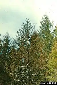 The larvae mainly feed on Pinus strobus. They are pale green larvae and can reach a length of about 12 mm. Young larvae spin silk and tie five to twenty pine needles together to form a tube. The larvae live within this tube. When the tube walls have been mostly eaten down, the larvae will abandon their tubes and begin constructing new ones. The species overwinters in the pupal stage within the tube.