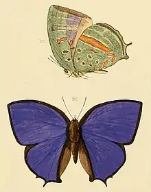 Above the male is deep ultramarine, of a pure colour though with but slight lustre. In the typical form from Celebes the under surface shows an intensely lustrous greenish tinge, only the postmedian transverse band is well developed, quite straight; proximally to it some scattered spots.[3]