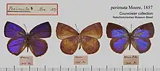 A. perimuta has been established as the type of a separate genus: Darasana Moore (1884),recognizable by the margin of the wings being on all sides rounded, whereby the tailless hindwing appears almost exactly oviform; only the apex of the forewing forms a slight point. Upper surface of male glaringly sky-blue with a black margin of about 1 mm width, under surface violettish-brown with dark, curved, almost parallel transverse lines.[2]