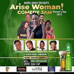Arise Woman! Comedy Jam is a Ugandan stand-up comedy show created and hosted by Akite Agnes.[1] The event happens annually[2] on International Women's Day in celebration of the achievements of the woman[3] in the society and has an all female cast. The show takes place yearly on 8 March. Proceeds from each show go to an identified Charity organisation[4]