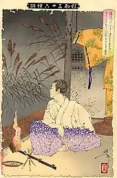 Among Narihira's children were the waka poets Muneyana (在原棟梁) and Shigeharu (在原滋春), and at least one daughter.[33] Through Muneyama, he was also the grandfather of the poet Ariwara no Motokata.[34] One of his granddaughters, whose name is not known, was married to Fujiwara no Kunitsune and engaged in a clandestine affair with Taira no Sadafun.[35]