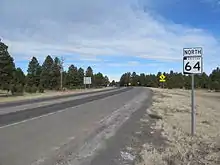 SR 64 was first designated as a state highway in 1932 as a route from Williams to the Grand Canyon.[2] In 1935, the highway was extended to the east from the Grand Canyon to US 89.[3] In 1961, the highway was extended further east from US 89 through Tuba City to the New Mexico state line.[4] In 1965, the portion from Teec Nos Pos was renumbered to SR 504 to match New Mexico,[5] which would be renumbered again in 1987 to US 64.[6] In 1965, the section to the east of US 89 became US 164,[7] and would later be renumbered to US 160 in 1969.[8]
