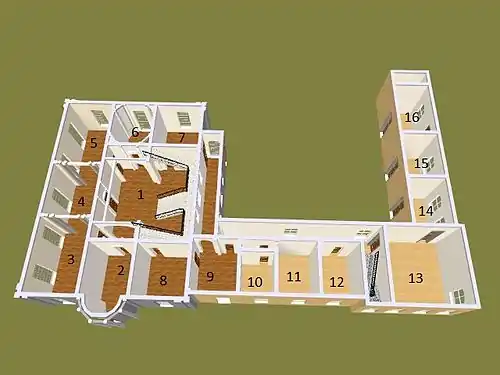 Also of note is the boudoir (6); this small room conceived a sitting room for the ladies of the house retains much of its original plasterwork and decoration in the style of Soane. Later additions include the marble fireplace, and mirrored alcoves and pilasters to the corners, creating an elongated hexagonal shape also in the style of Soane. Other rooms are now much altered, the dining room (8) was created from the former library in the 1860s, while the music room's once ornate and painted papier mache ceiling is now lost due to the building deprivations following World War II. At the time, the National Trust, permitted to carry out only limited work, prioritised the creation of staff flats on the upper floor, over the conservation of the house.[5]: 17