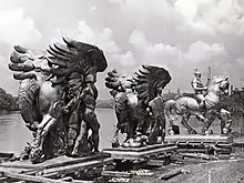 The northeastern entrance to the Arlington Memorial Bridge features The Arts of War sculptures, Sacrifice and Valor, which were completed by Leo Friedlander in 1951.[2][65] One of which was cast by Ferdinando Marinelli Artistic Foundry of Florence, Italy. On the pylons of each pier of the bridge are large circular discs with eagles and fasces designed by sculptor Carl Paul Jennewein.[64][70]