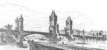Congress first proposed a bridge at the site of the current structure on May 24, 1886. The resolution required that the United States Department of War study the feasibility of a bridge at the site, and a 24-foot (7.3 m) wide design was proposed later that year.[4] The following year, the War Department suggested a "Lincoln-Grant Memorial Bridge". The Washington Post supported the idea of naming the bridge after both Robert E. Lee and Grant.[5] Congress again passed a resolution requesting another design, and in late 1887 the department proposed a "General Ulysses S. Grant Memorial Bridge". The new bridge would be a suspension bridge 105 feet (32 m) high, with 98 feet (30 m) of clearance below it.[6] Designs for the bridge at this time included a bare steel truss bridge, a low masonry arch bridge, and a Romanesque Revival structure by Paul J. Pelz with two massive central towers, two barbicans on each end, and exuberant ornamentation.[7] Senator John W. Daniel sponsored legislation in 1897 funding a survey of the bedrock in the Potomac River.[8] Congress approved the legislation the same year, and the United States Army Corps of Engineers began the survey in July.[9] The survey was delivered in March 1898.[10]
