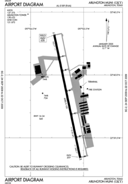 Arlington Municipal Airport (ICAO: KGKY, FAA LID: GKY) is five miles south of Arlington, in Tarrant County, Texas.[1] The airport is at the intersection of Interstate 20 and South Collins Road; it is a reliever airport for Dallas/Fort Worth International Airport and Dallas Love Field.