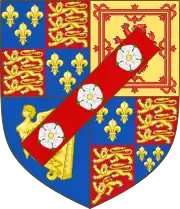 Quarterly: I and IV, grandquarterly azure three fleurs de lys or (France modern) and gules three lions passant guardant or (England) ; II, or, a lion gules, double tressure flory and counter-flory of the same (Scotland); III, a harp or, stringed argent (Ireland); a baton sinister couped gules, charged with three roses argent, seeded and barbed vert, brochant sur-le-tout. |