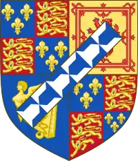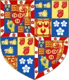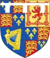 Quarterly: I and IV grandquarterly azure three fleurs de lys or (France) and gules three lions passant guardant or (England) ; II or, a lion gules, double tressure flory and counter-flory of the same (Scotland) ; III azure, a harp or, stringed argent (Ireland) ; a baton sinister couped azure compony argent of six pieces, each piece argent charged with an ermine spot sable. |