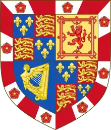 Quarterly: I and IV azure three fleurs de lys or, a bordure engrailed or ; II and III or, a fess chequy argent and azure of three rows (Stuart) a bordure gules with eight buckles or ; sur le tout argent, a saltire gules, between four roses of the same, seeded or and barbed vert (Lennox).