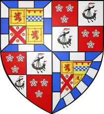 Quarterly: I and IV azure three fleurs de lys or, a bordure gules with eight buckles or ; II and III or, a fess chequy argent and azure of three rows (Stuart) a bordure engrailed gules ; sur le tout argent, a saltire gules, between four roses of the same, seeded or and barbed vert (Lennox).