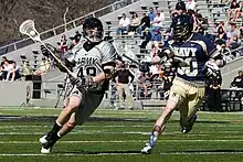The Army–Navy lacrosse rivalry is an intercollegiate lacrosse rivalry between the Army Black Knights and the Navy Midshipmen. The two programs, historical rivals in other sports like football and soccer, have a fierce and nationally-relevant rivalry in lacrosse as well. With 25 national championships, 10 Final Fours in the NCAA era, and 190 consensus first team All-Americans, the two teams have been integral to the game's history.[1][2] The rivalry carries a different spirit than many others in collegiate lacrosse, described by former Navy goalie Ryan Kern as: "t’s the same camaraderie that you had in the fall with the football game and it kind of comes out again in the spring with the lacrosse game,” Navy junior goalie Ryan Kern said. “No doubt, all the other sports are important, but just the sheer number of people that come to this game is crazy — just like the football game. You see 16,000 people come to a regular season lacrosse game, and that’s not happening at other lacrosse programs."[3] After 101 meetings, Navy leads the series 62–36–3 through 2021.[1]