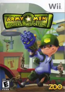 Army Men: Soldiers of Misfortune is a third-person shooter video game developed by Big Blue Bubble and published by Zoo Games for Wii, Nintendo DS and PlayStation 2, becoming a Nintendo exclusive in Europe. It is the latest home console game in the Army Men series and the only one to be released on seventh-generation platforms. It is a major departure from prior games in the series in that players assume the role of Private Timmy Reynolds who plays with toy soldiers instead of the toy soldiers themselves, shrinking down to their size to participate in a war among them. The game includes 15 levels and a variety of weapons provided by the player.