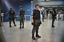 Members of the Brazilian Military Police identified by the use of helmet and black brassards with the letters "PE" in white (or blue-collar and white helmet with red letters).