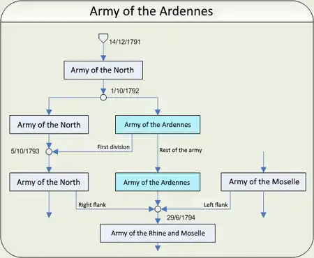 It was reorganized by a decree of the Conseil exécutif on the first of March 1793, leading to only the right flank of the army keeping the name of Army of the Ardennes. The first division of the Army of the Ardennes re-merged back into the Army of the North on 5 October 1793, at which date the rest of the Army of the Ardennes continued as the Army of the Ardennes until 29 June 1794, when it merged with the Army of the North's right wing and the Army of the Moselle's left wing to form the Army of Sambre-et-Meuse.