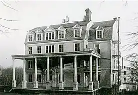 In the spring of 1886, after Marsh's death, Hoffman "decided to remove the old building, and [erect] in its stead [the] Hoffman Building."[1][28] The Tavern's demolition was prevented by Morristown historian and lecturer Julia Keese Colles.[6][7] To preserve the building, Colles arranged to move the building from the Morristown Green to her estate on Mount Kemble Avenue.[7][8] One source claims it was "dragged by a team of twelve oxen."[29] The Hoffman Building was completed by 1896.[28]