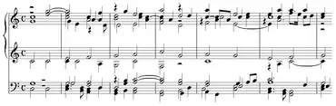 Schlick's letter to Bernardo Clesio contains his only known late works: a set of eight settings of the sequence verse Gaude Dei genitrix (from the Christmas sequence Natus ante saecula) and a set of two settings of the Ascension antiphon Ascendo ad Patrem meum.[41] Both sets have didactic purposes. Gaude Dei genitrix settings establish various ways of reinforcing a two-voice setting, in which the chant is accompanied by moderately ornamented counterpoint, by duplicating both lines in parallel thirds, fourths, or sixths. The pieces, which may have been intended for voices rather than the organ,[42] range from three- to five-voice settings. Schlick himself noted the didactic aspect, writing that he "found and made a separate rule for each setting, which are so clear that it will be easy to set all chants in the same manner." His Ascendo ad Patrem meum settings serve a different purpose, but also are a miniature encyclopaedia: the first setting is in two voices (and so the most basic of all possible settings), whereas the second is in ten voices (and so the most advanced of all possible settings). The ten-voice work is unique in organ repertoire, both for the polyphonic scope and the pedal technique.[43]