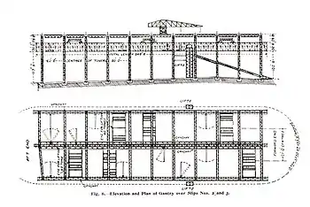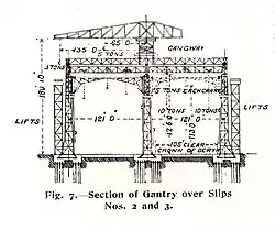 The Gantry was built on three rows, 120 feet (37 m) apart, of eleven steel truss towers with three large truss girders between them, and lighter crosswise Warren trusses above this. The large girders provided runways for a pair of 10-ton overhead cranes above each way and lighter 5-ton jib cranes from the sides. Along the centre line ran a light Titan crane, with a reach of 135 feet and able to carry a 3-ton load at full radius, and 5 tons closer in. The cranes were electrically-powered and built by Stothert & Pitt of Bath.[5] Access to the high girders was provided by three long ramps and also electric lifts for the shipyard workers.[8] As Harland and Wolff were primarily a commercial yard,[9][lower-roman 2] there was no need for the huge Titan cranes being built at this time for the naval shipyards of the Clyde, where heavy lifts of armour plate, or even entire turrets, were needed.[lower-roman 3]