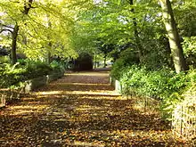 In 1240 it was owned by Roger de Montalt, 1st Baron Montalt.[2] There is reference to a watermill in Arrowe in 1347.[3] From the mid 15th century until the 17th century Arrowe was owned by the Dutton family of Dutton, Cheshire, who were declared Lords of Arrowe. During the 18th century many farms sprung up around Arrowe.[2] Arrowe Township was a block of land, east to west, between Arrowe Park Road and Limbo Lane and north to south, from Arrowe Brook Lane and the Arrowe Brook Road area, to Thingwall Road East and Thingwall Road.[3] The township was in the parish of Woodchurch and included the hamlet of Arrowe Park. The population was 96 in 1801, 105 in 1851 and 121 in 1901 but had been abolished by 1933.[4]