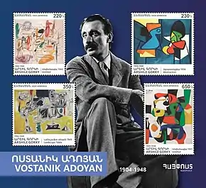 Arshile Gorky (/ˈɑːrʃiːl ˈɡɔːrki/ AR-sheel GOR-kee; born Vostanik Manoug Adoian, Armenian: Ոստանիկ Մանուկ Ատոյեան; April 15, 1904 – July 21, 1948) was an Armenian-American painter who had a seminal influence on Abstract Expressionism. He spent the last years of his life as a national of the United States.[1] Along with Mark Rothko, Jackson Pollock and Willem de Kooning, Gorky has been hailed as one of the most powerful American painters of the 20th century. The suffering and loss he experienced in the Armenian genocide had crucial influence at Gorky's development as an artist.