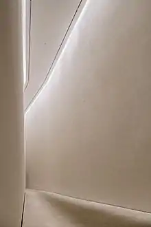 The interior consists of a cluster of surprising spaces that turn light red in the sunlight. The slope of the walls at the entrances is 58 degrees, referring to the existing building called Vleugel 58. The visitor experiences the building with all his senses. The variation in exhibition spaces also plays a part in this: one room has no daylight, another is high and narrow, and another is large and wide, with a view of the garden.[2]