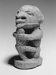 The nomoli or pomdo stone carvings of unclear origin have been discovered buried around southern Sierra Leone. The figures were first described by Europeans in 1852 by missionary George Thompson who discovered a group of five of them on the site of a destroyed village.[10] The human figures, carved out of soapstone, are found throughout a large area that was controlled primarily by the Temne until the Mende entered in the 1600s.[11] When asked about the statues by early explorers, the people in the region expressed the belief that they were the work of spiritual beings and that no one in the communities knew how to make such a figure.[12][10]
