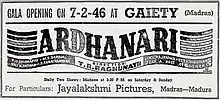 Arthanaari is a 1946 Tamil language film directed and produced by T. R. Raghunath. The film stars P. U. Chinnappa, T. R. Ramachandran, M. S. Saroja and M. V. Rajamma with N. S. Krishnan, T. A. Madhuram and Kali N. Rathnam playing supporting roles.[2]