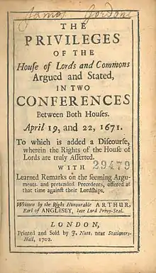 - Annesley, Arthur (1702), The Privileges of the House of Lords and Commons Argued and Stated, in Two Conferences between both Houses. April 19, and 22, 1671. To which is Added a Discourse, wherein the Rights of the House of Lords are Truly Asserted. With Learned Remarks on the Seeming Arguments, and Pretended Precedents, Offered at that Time against their Lordships., London: J. Nutt, OCLC 642442297