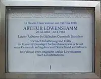 At the initiative of the Spandau Borough Council, a memorial tablet was unveiled in 1988 on the site of the former synagogue.[14] A memorial plaque was placed on the pavement in front of Löwenstamm's former home at Feldstraße 11, in Spandau, on 9 November 2005.[15]