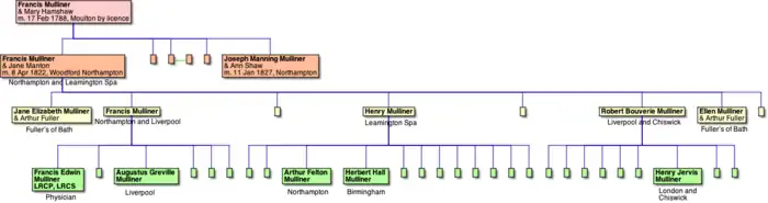 - Francis Mulliner (1824-1886) eldest son, who stayed in charge of the Northampton business until 1870, his mother died in 1875 aged 79, when he purchased Robert's Liverpool business and went to live in Birkenhead. His second son was Augustus Greville Mulliner who took over the Liverpool business.[1]