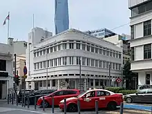 Located at the corner of Jalan Tun H. S. Lee and Jalan Hang Lekir (the former High Street and Cecil Street) in Kuala Lumpur,[18] the Lee Rubber Building was the tallest building in KL when it was constructed.[19] Modernist Art Deco rules this building with its striated lines and mouldings complete with differentiated corner treatment topped with a requisite flag pole. Its five-foot way is broken by solid wall-like pillars.[20] It has a strong geometric shape that meets a corner set at a 45° angle.[21] Like most urban Art Deco buildings, the Lee Rubber Building has a flat roof with no cornice or overhang.[22] Its pediment still sports the original name, in English and Chinese.[23]