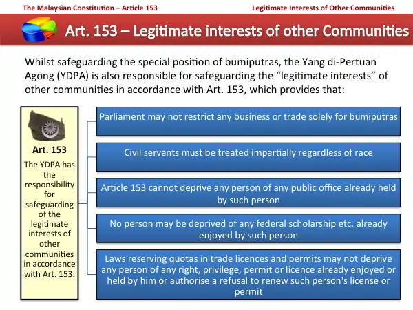 - It shall be the responsibility of the Yang di-Pertuan Agong to safeguard the special position of the Malays and natives of any of the States of Sabah and Sarawak and the legitimate interests of other communities in accordance with the provisions of this Article.