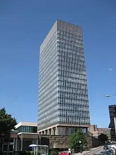 The Arts Tower is a building at 12 Bolsover Street in Sheffield, England, belonging to the University of Sheffield and which opened in 1965. A spokesperson for English Heritage described it as "the most elegant university tower block in Britain of its period".[1] At 78 m (256 ft) tall, it is the second-tallest building in the city, after the 101 m (331 ft) St Paul's Tower on Arundel Gate, which was topped out in 2009.[2] Mitchell Construction a British civil engineering firm, built the Arts Tower.[3] Photographs from their topping out ceremony in October 1964 help to document a different era in UK working conditions.[4]