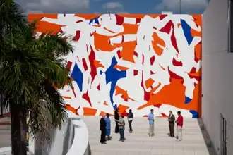 Herrera's wall paintings—the first for an outdoor billboard in Chicago in 1994—were seamless, hard-edged works combining appealing colors and rhythmic dances of repetitive abstract forms and vernacular imagery vaguely suggesting fantasy or narrative.[9] Early works ranged from explicitly figurative and overtly sexual—the black contour-lined outdoor Out of Twenty-four (MCA Chicago, 1995)—to the largely abstract: the indoor Tale (Randolph Street Gallery, 1995), a continuous, varied torrent of cartoony orange blobs, billowings and curvilinear shapes.[9][28] Subsequent wall paintings included All I Ask (Walker Art Center, 1999), which featured densely packed, vaguely referential, white-outlined forms on brown;[32][5] When Alone Again (Hammer Museum, 2001), a gestural, red-latex-on-white work;[16] and the spare, abstract Untitled (Wall painting for Berlin) (2005).[10] In later wall paintings Herrera has worked in a primarily abstract vein—often lyrical dances of positive and negative or different-colored forms.[3][52] They include Adam (Linda Pace Foundation, 2013); Come again (Gladstone Gallery, 2015); Half-Time (Tate Modern, 2016); and the 6,500--square-foot, outdoor wrap-around work, Wall Painting for Austin (2022).[53][54][3][55]