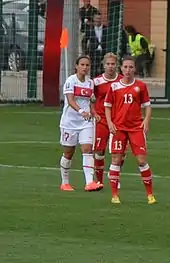 Finally, she made her debut in the Turkey women's national team in the UEFA Women's Euro 2013 qualifying – Group 2 match against the Romanian side on 23 November 2011.[3][30] She took part in the 2015 FIFA Women's World Cup qualification – UEFA Group 6 match first time against Montenegro on 28 November 2013.[31][32][33] She scored her team's honor goal in the match against the women from Wales that ended with 1–5.[34]