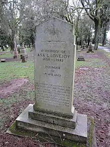In his later years he was involved in a variety of business ventures in Oregon, including as a major shareholder in the Oregon Telegraph newspaper and vice-president of the Willamette Steam Navigation Company.[2][8][23] He served on the Portland Public Schools board from 1868-1871.[24] Lovejoy died on September 10, 1882, at the age of 74 and was buried in the Masonic section at Lone Fir Cemetery in Portland.[25] Lovejoy Street in Portland is named after him,[3] and the character Reverend Timothy Lovejoy in The Simpsons is named after this street.[26][27][28] The fountain at Lovejoy Fountain Park in downtown Portland is named in his honor.[1]