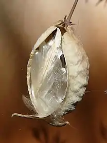 Heart-leaf milkweed is a perennial that grows to a height of 0.3 to 0.6 m (1 to 2 ft), with dark red-purple flowers whose hoods are slightly elevated above the base of the corolla.[4] The flower structure is unusual—it has five stamens fused into a column, with five circular attachments called 'hoods', and an anther head surrounding the large stigma at the flower's center. The fruit (photo at left) is a follicle with many flat seeds that have silky hairs which disperse easily in the wind. The large opposite leaves are cordate, or heart-shaped.[5] The plant grows in open or shaded woodland, often on rocky slopes and in mixed coniferous forest.[6] The milkweeds are named for the milky sap which exudes from the plant's stem.[5]