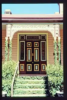 The top of the facade is marked by two flying gables with triangular pediments and semi-circular valances with a central finial. The gables are supported by decorative timber brackets and they frame vertical timber panelling on the face of the building. The gables surmount small, elongated oriel windows with narrow rectangular glass panels. In the centre of the facade is a neo-classical triangular pediment which surmounts a Dutch-style pediment with a decorative timber "heart" motif in the centre. On ground level, a protruding set of doors framed in Gothic style arches are protected by a double awning, the top layer convex and the bottom layer concave. The two awnings are separated by a large fascia board decorated by rectangular panels.[1]