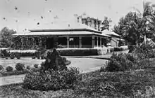 Ascot House, a single-storey timber residence with an attached two-storeyed timber extension, referred to as a folly, has been called the largest and most extensive of the grand Toowoomba residences. While the exact construction date is unknown, Ascot was possibly built in the 1870s as a private residence for Frederick Hurrell Holberton, a Toowoomba storekeeper and later Member of the Queensland Legislative Council. The architect of Ascot house remains unknown. When built, the house stood on about 32 acres (13 ha) of land near the Toowoomba racecourse. The grounds of Ascot contained a glasshouse, stables, croquet greens, tennis courts and extensive gardens, which included trees and shrubs bought from overseas.[1]