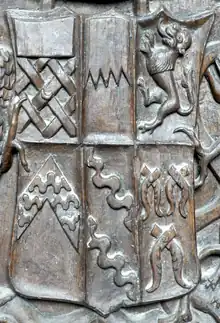 Above within a chaplet is an escutcheon showing the arms of Beare: Argent, three bear's heads and necks erased sable muzzled or,[53] with a crescent for the difference of a second son, impaling Leach, lords of the manor of Cadeleigh: Ermine, on a chief indented gules three ducal coronets or.[54] Sir Walter Leach (1599-pre-1637) was the eldest surviving son and heir of Sir Simon Leach (1567–1638), of Cadeleigh, Sheriff of Devon in 1624. George Beare was also seated at the estate of Frankmarsh,[55] near Barnstaple[56] and was a barrister of the Middle Temple and a judge of oyer and terminer during the reign of King Charles I.[57]
