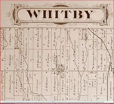 In 1857, Whitby Township was divided into two municipalities: East Whitby, and Whitby. Ashburn was one of the principal villages of Township of Whitby, together with Brooklin and Myrtle. In 1869, Ashburn had a population between 100 and 250, with a stage coach to Uxbridge and Whitby, daily mail, an Orange Society (No. 176), three stores, two hotels and several blacksmiths and wagonmakers.[7] Between 1870 and 1872, a railway was built from Port Whitby on Lake Ontario to Port Perry on Lake Scugog, crossing Myrtle Road two kilometres east of Ashburn. The Port Whitby and Port Perry Railway—which was dismantled in 1941—allowed the hamlets of Whitby Township to ship grain and timber south to the railway mainlines along Lake Ontario. In 1875, the hamlet had a population of 150.[8] In the nineteenth century the local Agricultural Society regularly held cattle fairs in the village.[9] By 1910, the village's population declined to 100, and had a daily stage to the railway station in Myrtle.[10] It was serviced by the Claremont and Ashburn Telephone Company, which later became part of the York and Ontario Telephone Union.[11]
