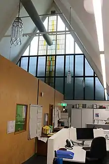 In 1977, when the Uniting Church was officially formed by the amalgamation of Methodist, Presbyterian and Congregational Churches, the Ashgrove Methodist Church became known as the Ashgrove Uniting Church.[63] In the 1990s (while the church remained in use) renovations were made to the interior including the removal of the original sanctuary and vestry. Much of the original furniture was removed and a new stained-glass window at the eastern end of the church was introduced.[1]