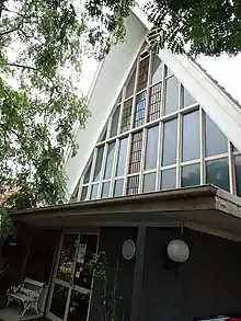 The former church (1962) is an A-frame building standing with its long sides parallel to Ashgrove Avenue on the highest part of the site. It is single-storey and its roof has a sloping ridgeline, taller and wider at its front (southwest gable end), where the former church's main entrance is. The steeply-pitched main roof is clad in green-coloured cement tiles with eaves extending low to the ground on both sides. The shape is formed by metal portal frames, which extend from below the eaves clear of the exterior walls and meet the ground on concrete footings. Both gable ends of the building have face brick walls and are glazed, with the front featuring a coloured glass cross pattern. The side walls on the southeast are face brick, the northwest walls are clad in timber vertically-jointed (VJ) boards and the subfloor is enclosed by hit-and-miss concrete blocks.[1]
