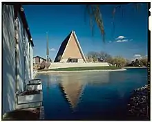 Gibson designed the new Ashgrove church as an A-frame Modernist structure and followed a traditional layout with a central aisle and front raised sanctuary. Impressive examples of this architectural form had been built in Europe and the United States, such as Frank Lloyd Wright's Meeting House of the First Unitarian Society, Wisconsin, and may have influenced Gibson's design for Ashgrove. Other examples of A-frame churches in the United States include Lutheran Concordia Senior College Chapel, Fort Wayne, Indiana and St Andrew's Lutheran Church, Illinois.[1][52]:10[48]:228