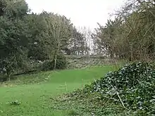 In its earliest form, the castle was an earth and timber ringwork fortification. The ringwork was located on a spur of high ground and consisted of a banked rampart surrounded by a deep ditch, probably re-using the earlier Iron Age defences. A Great Hall and/or tower stood within the ringwork. Extending westwards in a loop from the ringwork was a second, outer bank enclosing a broadly rectangular court - the bailey - which contained all the ancillary domestic buildings associated with such a settlement. Both banks were surmounted by wooden palisades.[9] Also located in the bailey was the parish church, St Mary's Church, Ashley, which probably dates from the same period as the original castle (early 12th century). The church survives, long outliving the castle. The visible remains of the castle now consist of sections of the ditch and ramparts.