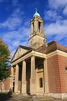 The school was constructed for the Foundling Hospital 1932–35 by the architect John Mortimer Sheppard. Set in extensive grounds, it is designed in a Neo-Georgian (Neoclassical) style, laid out as a symmetrical group of school buildings linked by colonnades of stone columns and organised around a courtyard. At the centre of the site, facing the entrance avenue, is the school chapel, topped with a tall cupola. The chapel is fronted by a large stone portico; four Doric columns support a large pediment which is emblazoned with the school coat of arms, consisting of an escutcheon depicting a baby and the moon and stars, and topped by crest of a lamb. It is flanked by a pair female supporters, the allegorical figures of Britannia and the eight-breasted Artemis of Ephesus. The motto is "Help". This heraldic device is similar to the arms of the original Foundling Hospital designed by William Hogarth.[3]