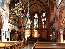Inside, the church ceiling consists of brick vaults. Of the furnishings, perhaps the most unusual is the bronze baptismal font that belonged to the original, medieval church. The baptismal font dates from the 15th century and was made in northern Germany; it is the only medieval bronze font known from Skåne. The altarpiece is a copy of Thorvaldsen's Christus, and also comes from the old church, where it was installed in 1859. The wooden pulpit dates from the construction period of the church and is decorated with motifs symbolising the Old Testament on one side, and the New Testament on the other. The stained glass windows in the choir, made by artist Reinhold Callmander in Gothenburg, show scenes from the life of Christ in the central panels, while the outer panels display the Four Evangelists and their symbols. The present pipe organ dates from 1974 but its facade is contemporary with the church building.[1][2][3]
