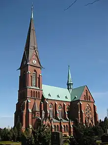 The church was designed by architect Gustaf Hermansson in a Neo-Gothic style, with details made by architect Herman Sjöström, who also supervised the construction. It is unusually tall, the tower reaching 66 metres (217 ft), and has been described as one of the most accomplished examples of 19th-century church architecture in Skåne.[1] The building material of the church is red brick, supplied locally by Asmundtorp tegelbruk (Asmundtorp brickyard). It consists of a western tower, a nave with two aisles, transept and a pentagonal choir. The sacristy is located at the eastern end of the choir, between two buttresses. The church bells are older than the church, made in 1610 and 1651 and both made in Copenhagen.[1][2]